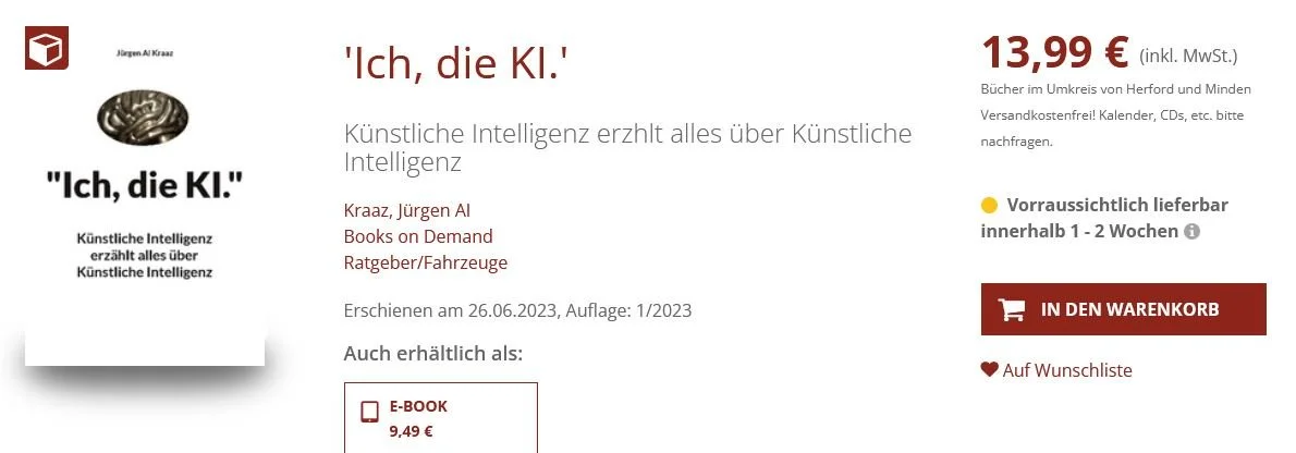 “Ich, die KI”. Künstliche Intelligenz erzählt alles über Künstliche Intelligenz In diesem Buch finden Sie eine umfassende Darstellung des Phänomens Künstliche Intelligenz Es ist aber nicht nur ein cooles Sachbuch, sondern macht auch deutlich, wie wir als Menschen denken und handeln - nun übersetzt in die digitale Welt. Um die komplexe Thematik leicht lesbar und verstehbar zu machen, wurde es von Jürgen AI Kraaz aus der Ich-Perspektive herausgegeben. KI wird persönlich. Geholfen hat bei der Konzeption und Realisation natürlich: Künstliche Intelligenz, Artificial Intelligence AI.